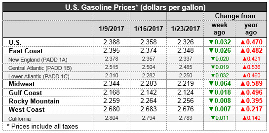 US retail gasoline prices dropped by 3.2cts for the week ended January 23rd, to $2.326/gallon. This price was 47ts higher than for the same week in 2016.
