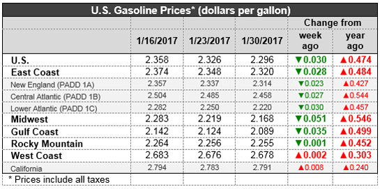 US retail gasoline prices dropped by 3.0cts for the week ended January 30th, to $2.296/gallon. This price was 47.4cts higher than for the same week in 2016.