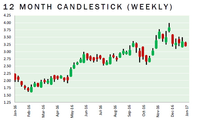 After ending the previous week on a high note, front month prices slid over 3.5% on Monday to close at $3.23. Despite the newest EIA January 2017 Short Term Outlook calling for nearly 10% increases of gas-fired power capacity by the end of 2018, markets have been susceptible to volatile weather in closer months. Monday saw calls for warmer-than-average temperatures prevailing strongly in the southwest and reverberating through the midcon and southeast in both the 10 and 16 day outlooks. These forecasts leave only small pockets in the northeast projected to require more demand than typical for this time of year. In addition to short term weather volatility, uncertainty surrounding the current political landscape between the U.S. and Mexico calls into question the stability of nearly 65% of U.S. natural gas exports.