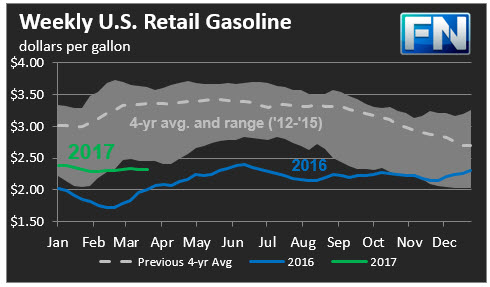 US retail gasoline prices declined by a modest 0.6 cents for the week ended March 27th, to $2.315/gallon. This price was 24.9 cents higher than for the same week in 2016.