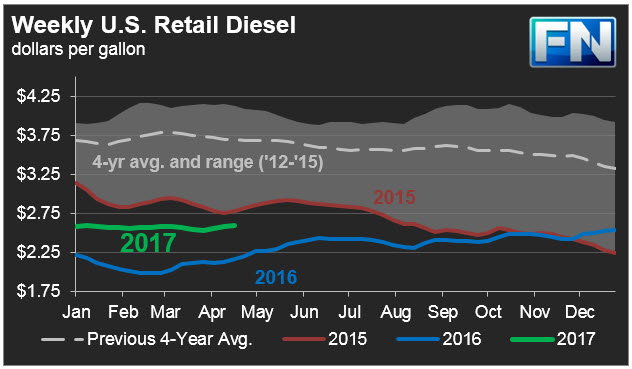 The Energy Information Administration (EIA) released its weekly data on diesel and gasoline retail prices for the week ended April 17th, 2017. Prices for both fuels rose during the week, as they have for the past three weeks.