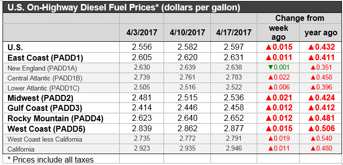 For the current week ended April 17th, diesel prices rose by 1.5 cents to an average price of $2.597/gallon.