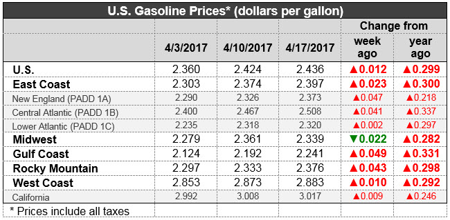 US retail gasoline prices increased by 1.2 cents for the week ended April 17th, to $2.436/gallon. This price was 29.9 cents higher than for the same week in 2016. Gasoline prices are at their highest levels since the week ended August 31st, 2015.