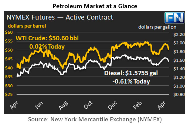 WTI crude prices are in the $50.50-$50.75/b range this morning. Wednesday brought a sharp downward price correction, and prices yesterday stagnated. WTI opened at $50.71/b today, an increase of $0.08, or 0.16%, above yesterday’s opening price. Current prices are $50.60/b, $0.11 below yesterday’s close. Product prices also dropped sharply Wednesday. Like crude, product prices levelled and were flattish Thursday, with gasoline showing more price strength than diesel.