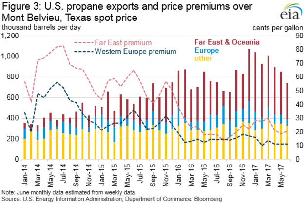 Prior to the addition of significant propane export capacity in 2015 and 2016, total U.S. export volume was restricted by limited infrastructure. Now, with increased capacity, producers may take advantage of export opportunities. Low tanker rates and additional locks in the Panama Canal have put downward pressure on export costs, and Asian and European markets have maintained price premiums for propane compared with the U.S. market. In the first half of 2017, premiums in Asian markets averaged 24 cents per gallon and premiums in European markets averaged 12 cents per gallon (Figure 3).