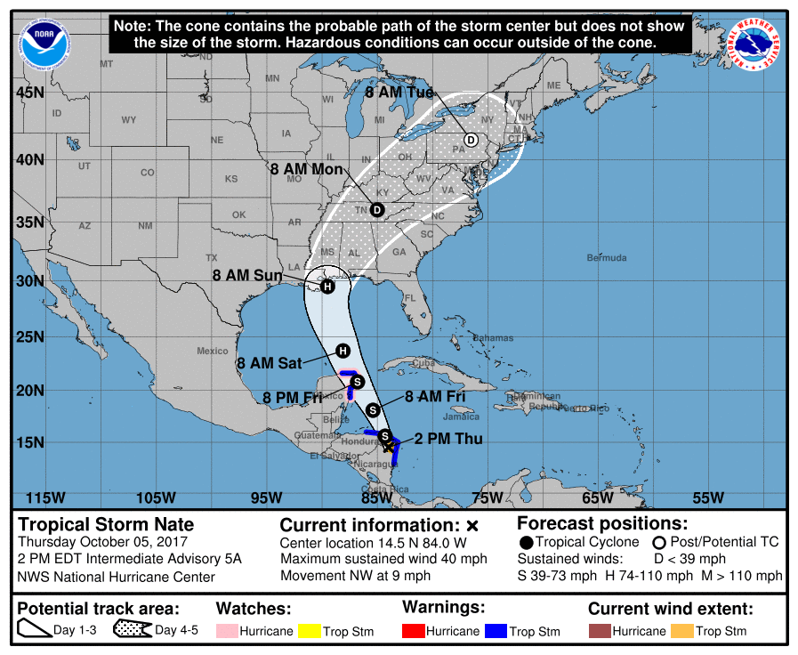 Tropical Storm Nate, as it became this morning, continues its trek towards the U.S. Since yesterday, the storm’s path has shifted west, with landfall now expected around New Orleans, though of course the path could change as the storm moves closer.