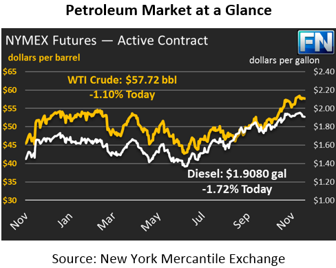 After a significant run in prices on Friday that added nearly $1.00 to crude prices, markets are falling back in line with their previous trends. Traders were enthusiastic on Friday that OPEC and Non-OPEC producers agreed to a deal extension, but that enthusiasm has faded today as reality sets in. After rising to $58.88 and backing down on Friday, prices this morning are down 64 cents (1.1%), currently trading at $57.52.