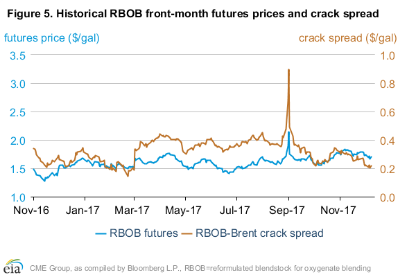 Gasoline prices: The front-month futures price of reformulated blendstock for oxygenate blending (RBOB, the petroleum component of gasoline used in many parts of the country) fell by 4 cents per gallon (gal) from November 1 to settle at $1.70/gal on December 7, 2017 (Figure 5). The RBOB-Brent crack spread (the difference between the price of RBOB and the price of Brent crude oil) fell by 8 cents/gal to settle at 22 cents/gal over the same period. EIA compares RBOB prices with Brent prices because EIA research indicates that U.S. gasoline prices usually move with Brent prices, the international crude oil benchmark.