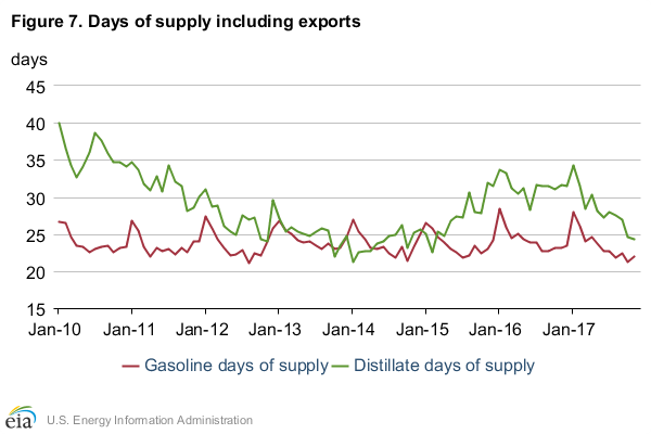 High demand for both gasoline and distillate resulted in each petroleum product’s days of supply in the U.S. market reaching the lowest levels in several years. When adding exports to product supplied in the traditional days of supply calculation, days of supply of total motor gasoline was 22 days as of the four weeks ending December 1, 2017 (Figure 7), slightly higher than the days of supply in October, which would have been the fewest days of supply since August 2012, if confirmed by the PSM. Similarly, days of supply of distillate fell to 24 days during the same period and would be the fewest days of supply since February 2015. The increasingly tight U.S. distillate market could make ULSD price increases more likely this winter if global demand for distillate remains high and if the United States experiences colder-than-normal temperatures in the U.S. East Coast, where heating oil is widely used for residential heating.