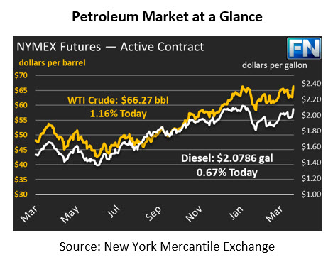 Oil prices continue their pursuit of higher prices. Markets began with some early gains this morning, with crude oil up 76 cents to $66.27. At this point markets have fully recovered from their February decline, and are approaching three-year highs once again. With the threat of Chinese trade barriers beginning to calm, markets are back to watching fundamentals and risk factors, which point to higher prices for the year.
