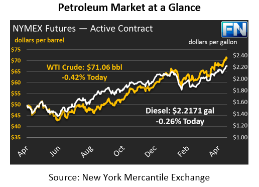 Fuel prices are also reversing their gains from yesterday. Diesel prices are currently trading at $2.2171, down 0.6 cents since yesterday. Gasoline prices are $2.1847, seeing small losses of 0.4 cents this morning.
