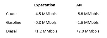 The API reported large draws in crude inventories this week and mixed product results. Crude drew by 6.8 MMbbls, exceeding market expectations. Gasoline drew by 1.6 MMbbls while diesel built by 2.0, brining products to a net 0.4 MMbbls build.