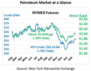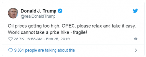 Imagine if you could alter the course of oil prices with just a few words…actually, 19 words, to be precise. Well, if your name is Donald J. Trump, then you’re just imaging this morning. With a single Tweet, Trump sent oil prices spiraling almost $2/bbl this morning after markets neared 2019 highs. After bottoming out at $55.70, prices have bounced a bit higher. This morning, crude oil is currently trading at $56.24, down $1.02 (1.8%) from Friday’s close.