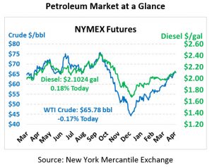 Fuel prices, on the other hand, are trading slightly higher this afternoon. Diesel prices are currently $2.1024, up 0.4 cents. Gasoline prices are trading at $2.1448, up 1.6 cents.