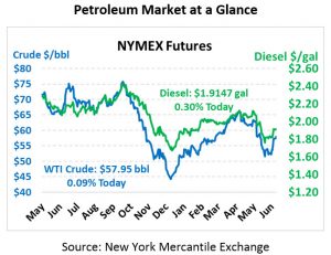 Fuel prices are mixed, with diesel generally tracking crude oil while gasoline has seen some strong upward momentum. Diesel prices are trading at $1.9147, up half a cent. Gasoline prices are $1.8655, a gain of 1.1 cents following last week’s shutdown at PES’s refinery in Pennsylvania. The outage has caused cargo prices for barged fuel to jump significantly, which will impact Northeastern fuel prices until the refinery resumes full operations.