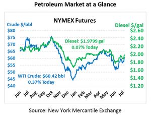Fuel prices are mixed, with diesel tracking crude while gasoline falls. Diesel is trading at $1.9799, flat with yesterday’s close. Gasoline is trading 1.1 cents low at $1.9786, dropping below diesel prices for the first time since the July 4 holiday.