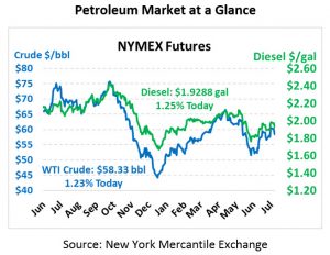 Oil saw steep losses to close the day on Tuesday, though the API’s report late yesterday helped give markets a lift. This morning crude oil is trading at $58.33, up 71 cents after shedding almost $2/bbl yesterday.