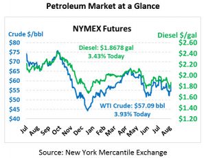 Fuel prices are also putting up some big gains. Diesel prices are currently trading at $1.8678, up 6.2 cents (3.4%) from Monday’s closing price. Gasoline prices are currently $1.7354, up a hefty 7 cents (4.2%).