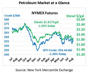 In a continuation of yesterday’s losses, oil prices are trading lower this morning. Crude oil prices are trading at $54.46 this morning, down 77 cents from Wednesday’s close.