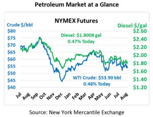 Oil prices ended yesterday with some fairly large losses despite early gains, with crude closing below $54 and diesel falling beneath $1.80 for the first time since early August. This morning, WTI crude is trading at $53.90, up 26 cents.