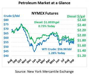 Oil prices are continuing their ascent this morning following yesterday’s lofty 4.3% gains. Prices are at their highest level in weeks, though it’s worth mentioning that WTI crude prices have not deviated from their $50-$60 band since May. Today, crude prices are currently $56.98, up 72 cents from yesterday’s closing price.