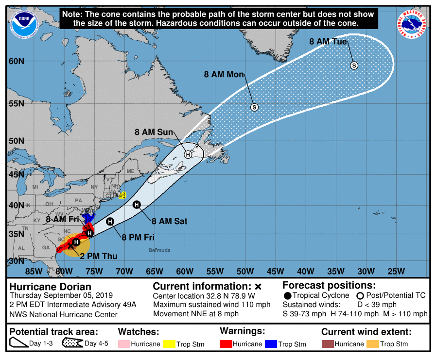 After rising to Category 3 this morning, Dorian returned has returned to a Category 2 Hurricane, and is currently travelling just 25 miles off the coast of South Carolina. The storm is expected to continue northward potentially impacting eastern regions of Canada by Sunday.