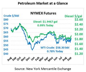 Fuel prices are trading higher as well, with diesel prices rising to levels not seen since July 31. Diesel is currently trading at $1.9467, a gain of 1.9 cents since Monday’s close. Gasoline prices are $1.5960, up 1.1 cents.