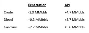 The API reported a surprise build for crude of 4.7 MMbbls versus an expected draw of 1.3 MMbbls. At Cushing, stocks fell with a draw of 0.3 MMbbls. The API reported distillates and gasoline had larger-than-expected builds. The EIA will report numbers later this morning.