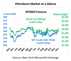 Yesterday brought another round of buying, pushing crude oil to close above $61/bbl. Today, prices are fading slightly, with markets slowing heading into a holiday week. Crude oil prices are currently $60.79, down 39 cents.