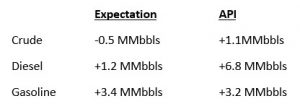 The API reported a surprise build for crude of 1.1 MMbbls versus an expected draw of 0.5 MMbbls. At Cushing, stocks fell with a draw of 0.1 MMbbls. The API reported distillates had a larger-than-expected build and gasoline had a build in line with estimates. The EIA will report numbers later this morning.