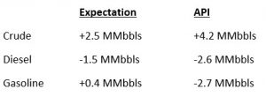 The API reported a larger-than-expected build for crude of 4.2 MMbbls versus an expected build of 2.5 MMbbls. At Cushing, stocks rose with a build of 0.4 MMbbls. The API reported distillates had a larger-than-expected draw and gasoline had a surprise draw. The EIA will report numbers later this morning.