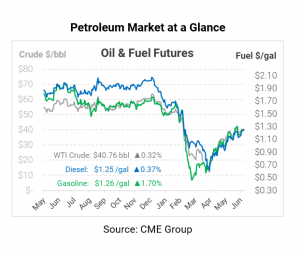 Oil markets are rising gently this morning after yesterday brought no change in price direction. This week the market will be sharply focused on July 4 demand data. Each year, millions of consumers hit the roads to see family and friends and gather for fireworks; this year, many of those plans were cancelled. The EIA’s demand data tomorrow will be an important indicator of just how resilient the recovery in gasoline demand is.