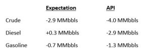 The API reported a larger-than-expected draw for crude of 4.0 MMbbls versus an expected draw of 2.9 MMbbls. At Cushing, stocks increased by 1.1 MMbbls. The API reported that distillates had a decrease in stocks. Gasoline inventories fell more than expected. The EIA will report numbers later this morning.