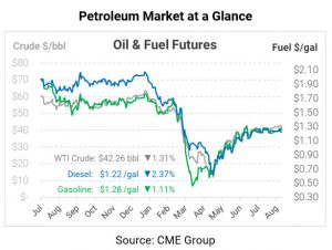 The petroleum complex is moving lower this morning on a strengthening dollar and COVID-19 concerns. WTI crude is currently trading at $42.26, down 56 cents (-1.3%).