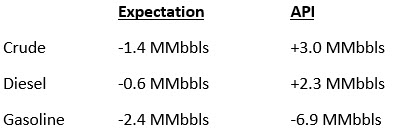 The API reported a surprise build for crude of 3.0 MMbbls versus an expected draw of 1.4 MMbbls.  At Cushing, stocks increased by 2.6 MMbbls.  The API reported that distillates had an increase in stocks.  Gasoline inventories had a large draw. The EIA will report numbers later this morning.