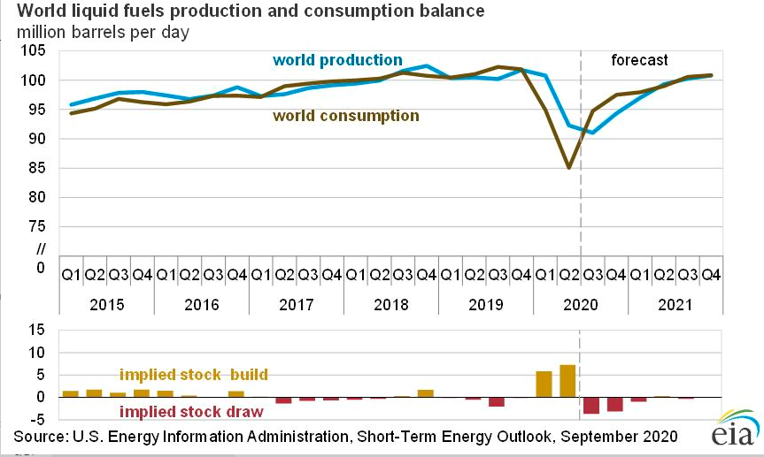 According to the EIA Short-Term Energy Outlook: “despite expected inventory draws in the coming months, EIA expects high inventory levels and surplus crude oil production capacity will limit upward pressure on oil prices. EIA’s forecast for growth in 2021 is 0.5 million b/d less than in the August STEO. The downward revision is largely a result of lower expected consumption growth in China, which EIA now forecasts to grow by 1.0 million b/d in 2021.”
