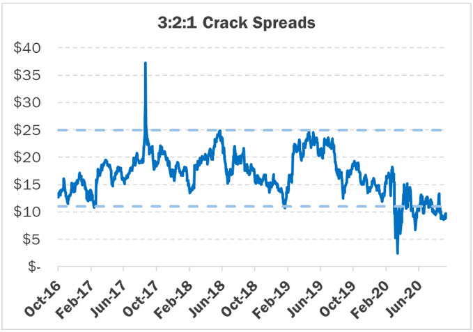 Refineries are in a tough spot heading into the winter as fuel demand has been suppressed. Refiners typically require 3:2:1 crack spreads – the price difference between crude and refined products – to be at least $10/bbl to turn a profit. Throughout history, spreads rarely fall below this range for prolonged periods. Yet refiners have had to contend with spreads averaging below $10/bbl since August. On one end, crude prices have slowly stabilized enough for producers to begin restarting output; on the other end, demand remains low. Reuters recently highlighted that refiners globally are facing tough financial pressures – they lack the cash to invest in maintenance but also will not benefit from skipping the fall refinery turnaround season.