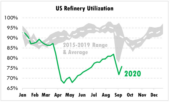 Weak crack spreads have halted the long, slow recovery in refinery utilization beginning in May. Climbing as high as 82% utilization in August, a strong of Gulf Coast hurricanes caused refineries to fall offline, taking utilization briefly down to 72% again. While refineries would typically rush to resume operations, refineries took their time in restarting.