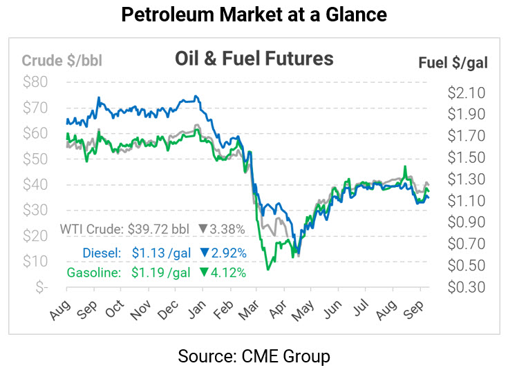 Fuel prices are also facing heavy losses this morning, giving up gains made last week. Diesel is trading at $1.1251, down 3.4 cents (-2.9%). Gasoline is currently $1.1857, down a nickel (4.1%) from Friday’s close.