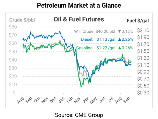 Fuel prices are showing very modest gains this morning, supported by continued demand recovery in the US and abroad. Diesel prices are currently $1.1291, up 0.3 cents since Friday. Gasoline is trading at $1.2174, also up 0.3 cents. Gasoline trading nearly 10 cents above diesel is somewhat a seasonal anomaly – heading into fall, gasoline prices usually sink lower, and diesel reigns supreme. But with diesel inventories still exceedingly high and gasoline inventories moving back to normal levels, markets are telling refiners to limit diesel outputs and prioritize gasoline now.