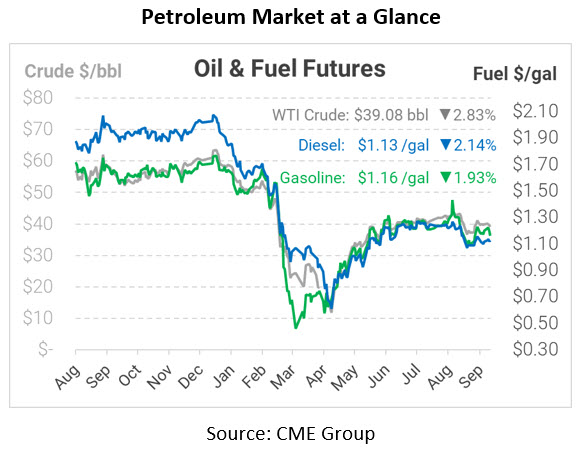 WTI Crude climbed 2.4% on Wednesday after the EIA reported that domestic crude had a surprise decrease last week – to the lowest levels since April. Crude fell back from intraday highs as demand concerns due to the pandemic and fading optimism for a stimulus package kicked in. Lagging gasoline demand is expected with peak driving season in the US behind us. Is the draw in diesel the start of a trend?