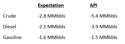 The API reported a larger-than-expected draw for crude of 5.4 MMbbls versus an expected draw of 2.8 MMbbls. At Cushing, stocks increased by 2.2 MMbbls. The API reported that distillates and gasoline had a decrease in stocks. The EIA will report numbers later this morning.