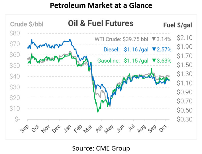 WTI crude is down sharply in early trading this morning. New restrictions to slow the surge of coronavirus cases has increased uncertainty about the pace of economic and fuel demand recovery: