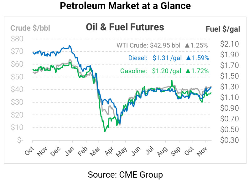 This morning, markets are moving higher as traders hope for rising demand in the near future. In addition, consensus is building that OPEC+ will maintain current cut levels through Q1 2021, which would keep an extra 1.9 MMbpd off the market compared to current Q1 cut levels. Crude oil is trading at $42.95 this morning, up 53 cents to the highest level since early September.