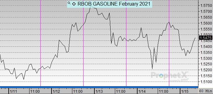 Gasoline opened the week at $1.5470. It followed a choppy path to eke out a small gain for the week. Gasoline opened Friday at $1.5597, a gain of 1.3 cents (0.8%).