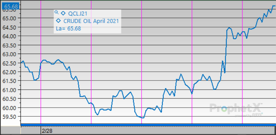 Crude oil prices opened the week at an elevated level – one of the highest trading prices in recent memory. Returning US production after the winter storm caused prices to fall below $60/bbl. The EIA’s surprising weekly report, filled with record-breaking numbers, turned the market around, and OPEC’s announcement sent prices soaring. Opening the week at $61.95 and opened on Friday at $64.16 – the highest in nearly two full years and a weekly gain of $2.21 (+3.6%).