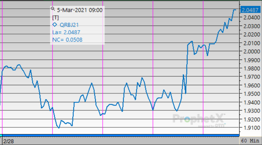 Like other products, gasoline prices began the week at an elevated level, fell midweek, then soared late on Thursday. Opening the week at $1.9622, gasoline opened this morning at $2.0029, a gain of 4.1 cents (+2.1%) and the highest trading price since July 2019.