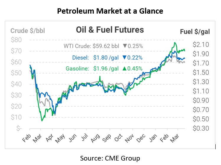 Yesterday saw crude and diesel prices rise thanks to supportive inventory news, while gasoline’s surprise build triggered a small price drop. Adding to inventory news, the Federal Reserve indicated they would continue with current supportive policies, providing continued aid to the recovering US economy. We shared yesterday that Iran could become the next major topic for oil markets – then yesterday the State Department announced it was prepared to lift sanctions “inconsistent” with the 2015 nuclear deal. Although the statement stops short of listing which sanctions or detailing how and when sanctions will be lifted, it shows a continued commitment to moving negotiations forward.