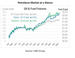 Adding to market enthusiasm, summer driving season is officially in full gear. Memorial Day kicks off the season as millions of Americans hit the road to celebrate with friends and family. Gasoline inventories are already clinging to the low end of historical inventory levels, signaling that supply could grow tight. Refiners are making their way back to historically normal utilization levels but are still lagging. If demand soars back to pre-pandemic levels before refiners can get back over 90% utilization, expect tight supply and higher gasoline prices this summer.