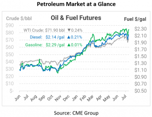 This morning, US crude oil prices are trading flat as traders continue monitoring new COVID-19 variants. Crude opened at $72.18, diesel at $2.1358, and gasoline at $2.2952. Markets are still locked in the continuing pattern – selling off due to COVID variants, then traders buy the dip and cause a surge in pricing.